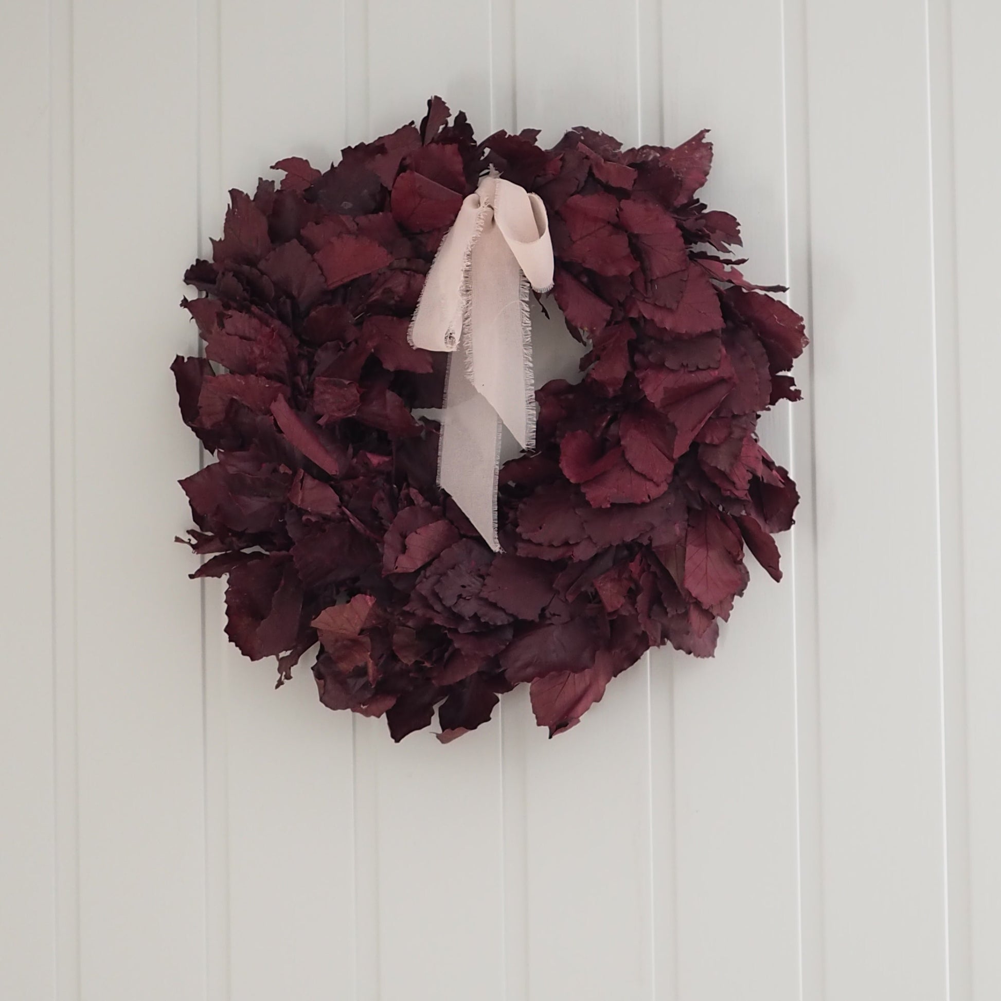 Preservert dørkrans i burgunder blader med en lys rosa sløyfe.