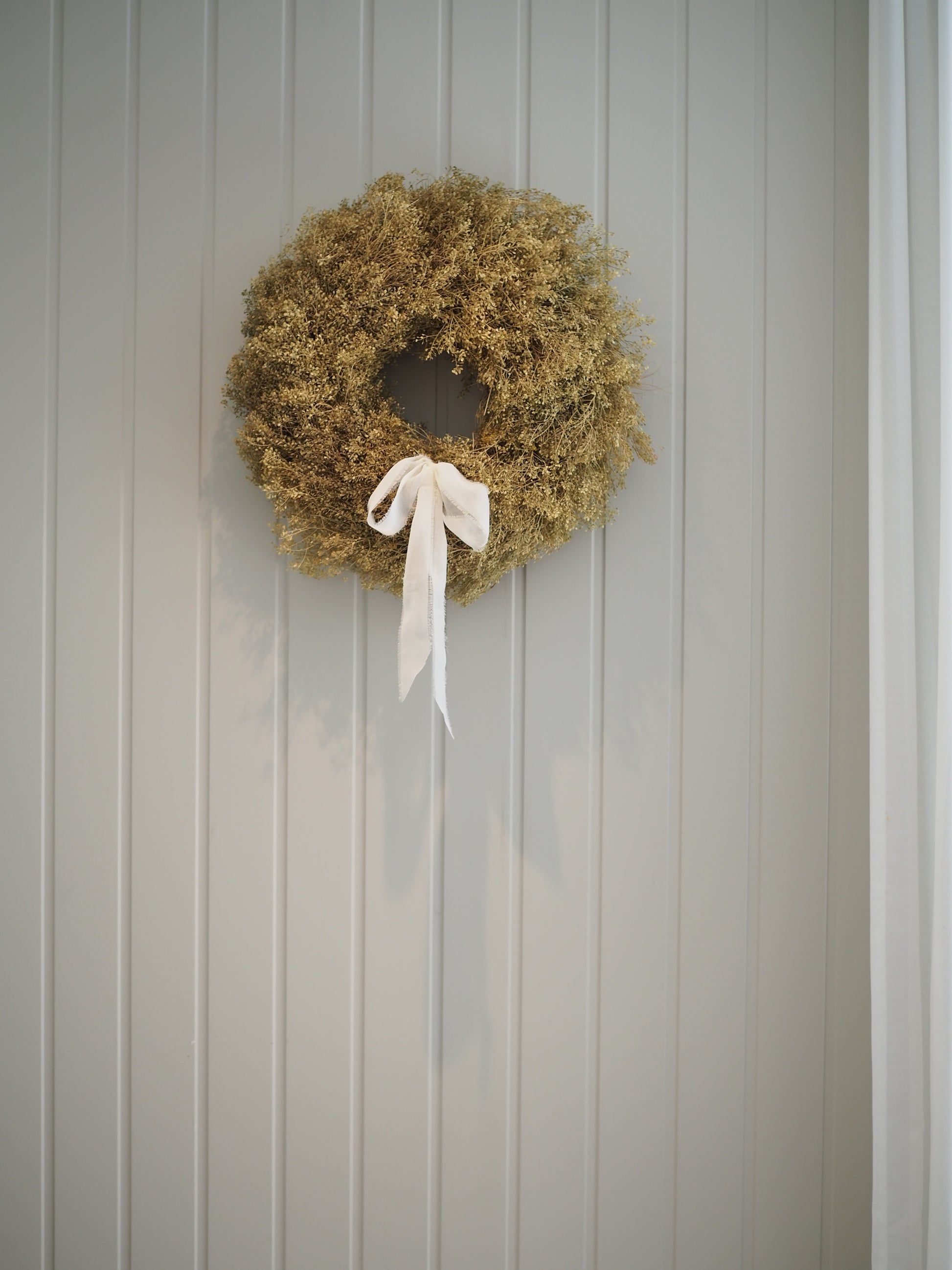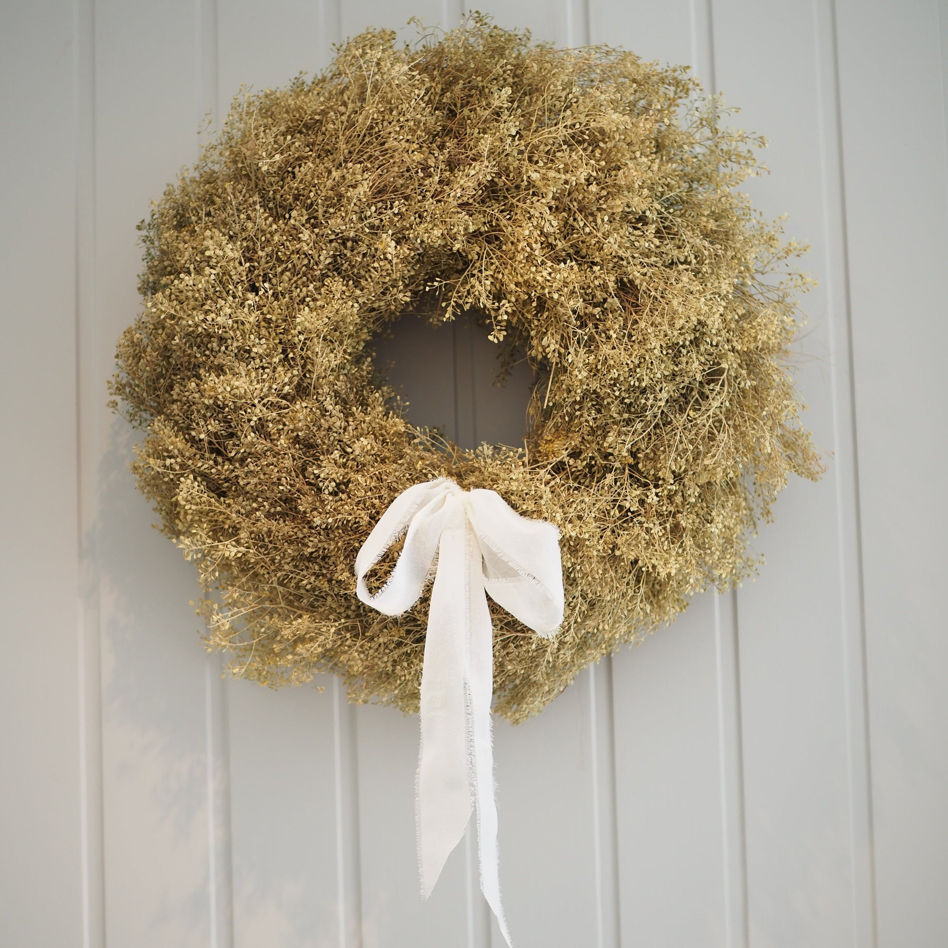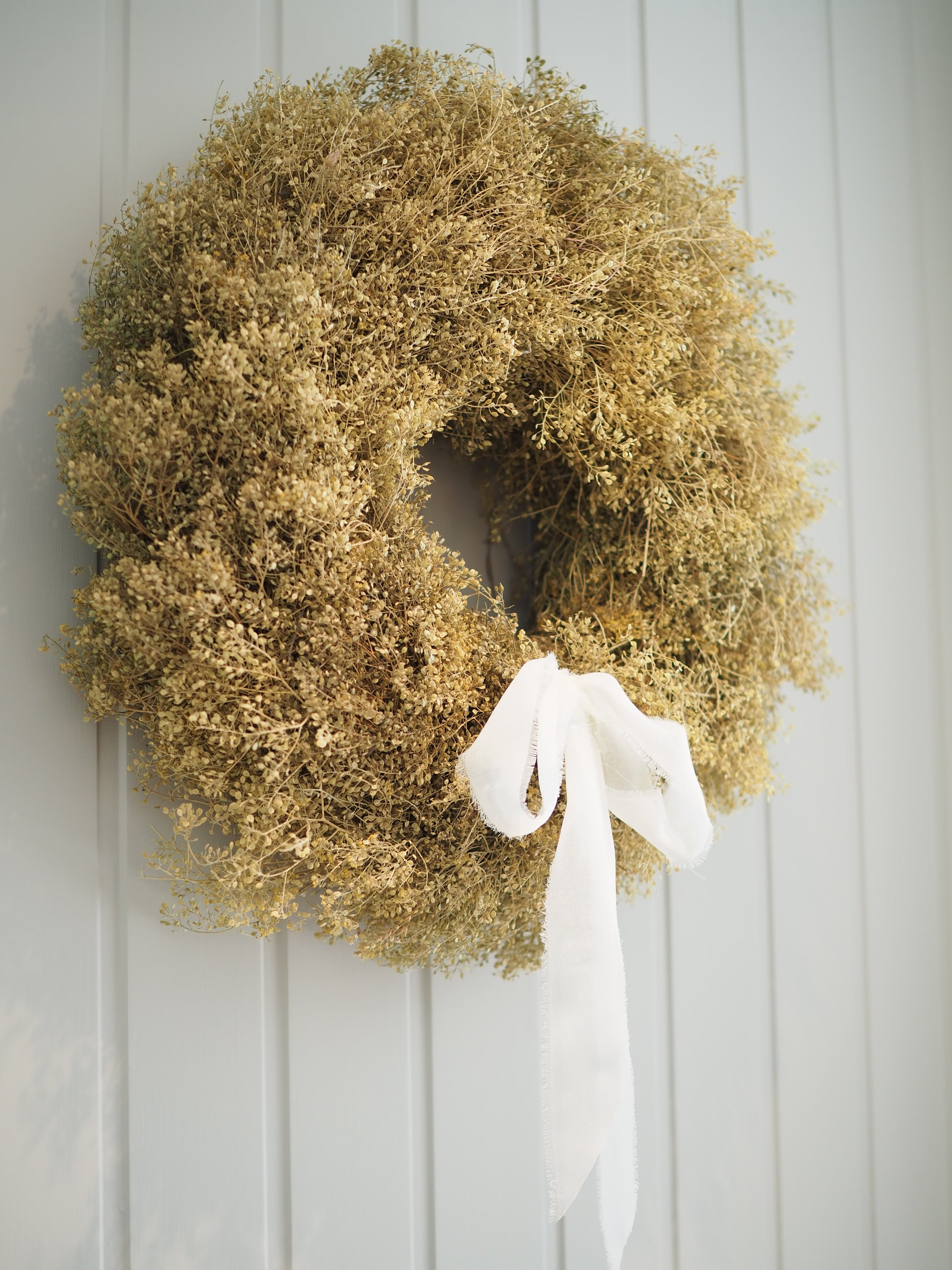 Tørket krans i grønngul farge med hvit sløyfe.